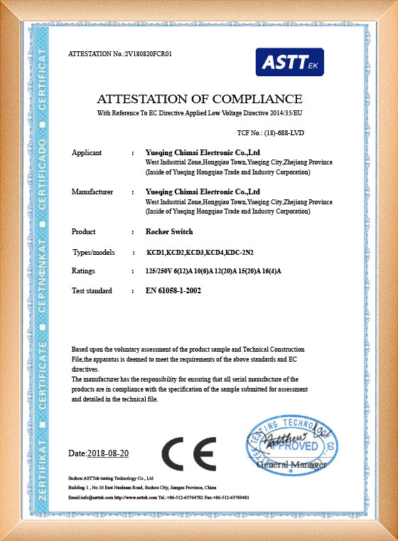 A Chimai Electronic é particularmente famosa por seus interruptores KCD do Egito. São interruptores elétricos acionados por um balancim, que se move para frente e para trás em um plano vertical. As chaves oscilantes são onipresentes em sistemas elétricos e são usadas em uma ampla gama de aplicações, incluindo automotiva, marítima e industrial.